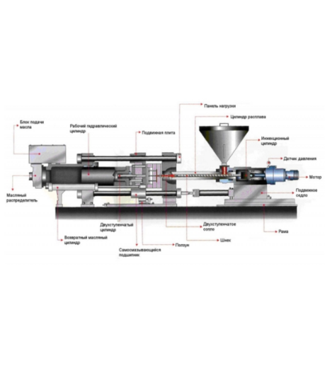 Технологический процесс изготовления фитингов литьем под давлением состоит в следующем. Предварительно подготовленное полимерное сырье в виде гранул загружается в бункер термопластавтомата, где оно захватывается вращающимся шнек поршнем и перемешивается по винтовому каналу шнека через обогреваемый инжекционный цилиндр, в котором оно прогревается, плавится и в виде гомогенного по температуре расплава накапливается в его передней сопловой части. При этом шнек-поршень отходит назад. Обогрев инжекционного цилиндра производится электронагревательными элементами. Затем поступательным перемещением шнека-поршня, осуществляемым посредством гидравлического привода, расплав полимерного материала впрыскивают в сомкнутую литьевую форму, закрепленную на неподвижной и подвижной плитах литьевой машины. После охлаждения отформованного изделия подвижная плита отводится , литьевая форма размыкается и изделие извлекается из формы.